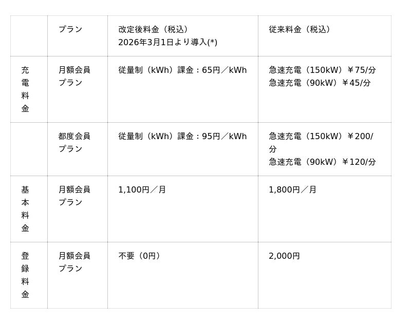 あわせて、月額会員プランの基本料金を従来の1,800円から1,100円へ大幅に引き下げ、登録料金を撤廃(無料化)することで、BEV(電気自動車)所有のハードルを下げ、より多くのユーザーに快適な 充電環境を提供します。