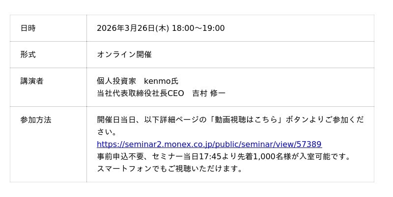 当日は「湘南投資勉強会」主宰の個人投資家・kenmo氏との対談形式にて、事業概要や成長戦略、今後の取り組みなどについてご説明いたします。個人投資家の皆さまに当社への理解をより深めていただける機会となっておりますので、ぜひご参加ください。