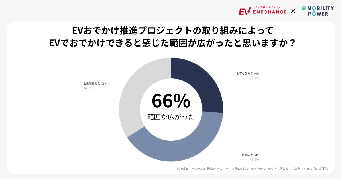 プロジェクト参加者を対象にアンケート調査(有効回答数500)を実施したところ、66%の参加者が「EVでおでかけできる範囲が広がった」と回答しました。