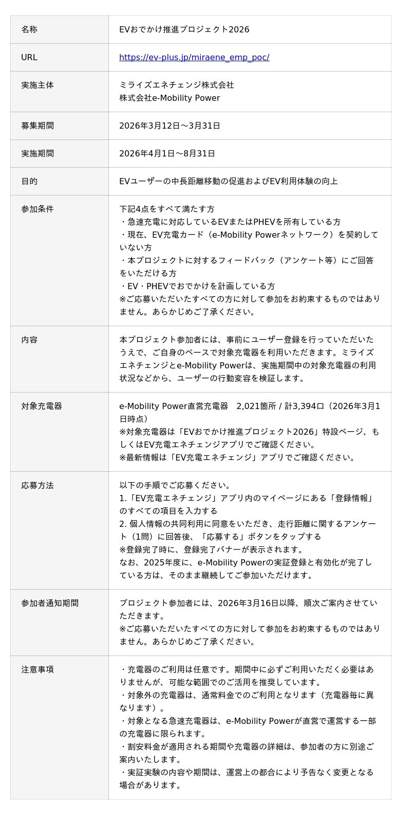 ミライズエネチェンジ株式会社(本社:東京都中央区、代表取締役社長:柘野 善隆、以下「ミライズエネチェンジ」)と株式会社e-Mobility Power(本社:東京都港区、代表取締役社長:池亀 耕太郎、以下「e-Mobility Power」)は、EVユーザーの中長距離移動を促進する取り組み「EVおでかけ推進プロジェクト」を、2025年度に続き、2026年度も実施することを決定しました。[画像1: https://prcdn.freetls.fastly.net/release_image/159688/39/159688-39-305731520b27d6e5d2428592025a18d5-2400x1260.png?width=536&quality=85%2C75&format=jpeg&auto=webp&fit=bounds&bg-color=fff ]