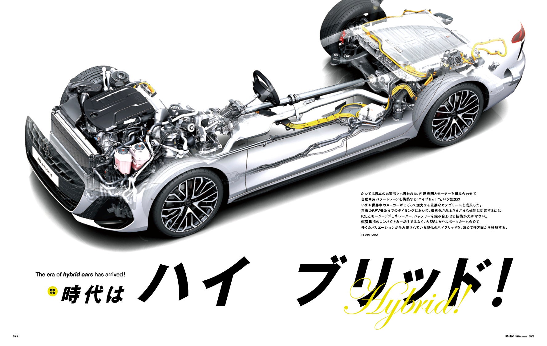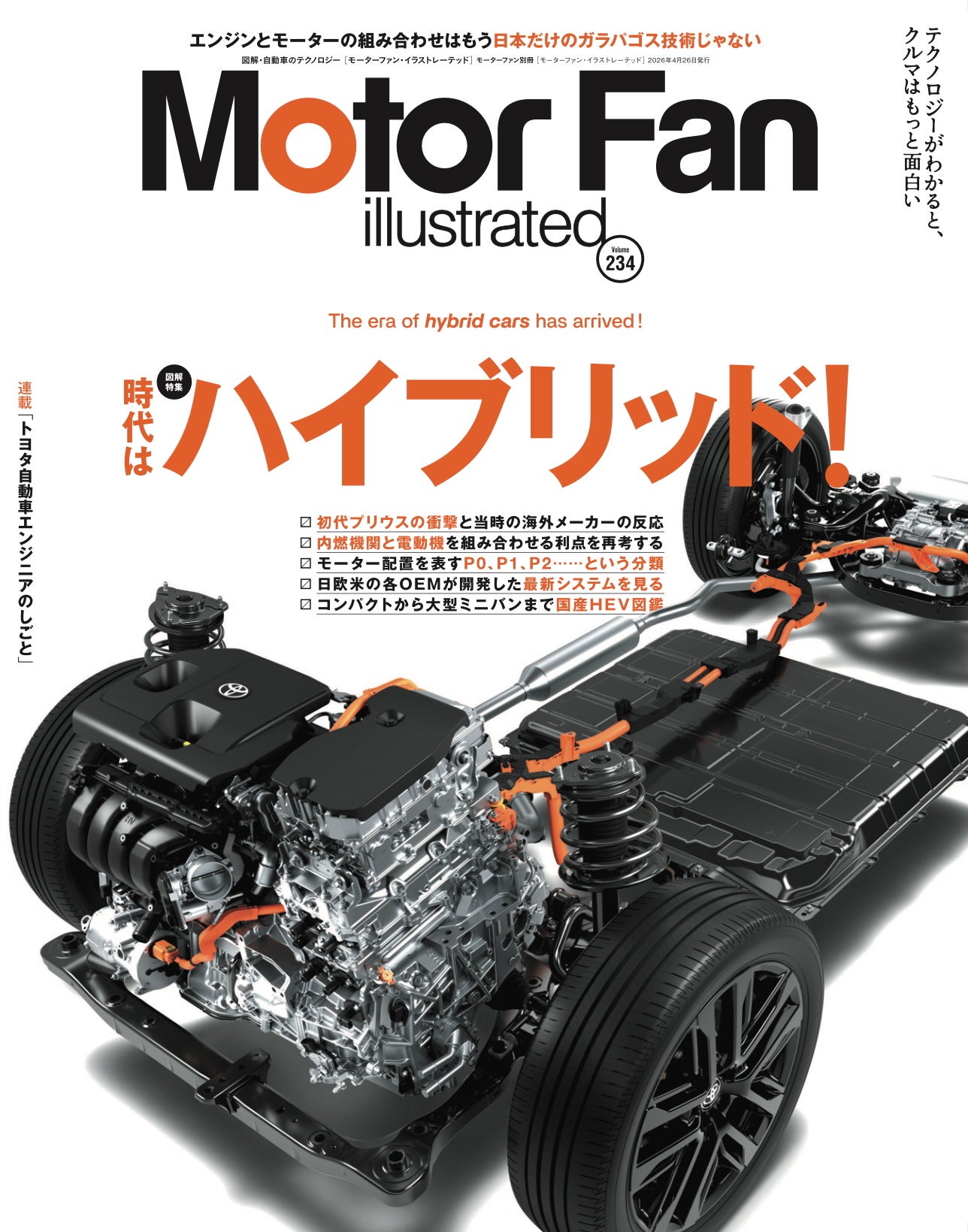「テクノロジーがわかると、クルマはもっと面白い」をコンセプトに、技術的な視点で自動車業界を分析する月刊誌モーターファン・イラストレーテッド。最新号となるvol.234は、巻頭特集として「時代はハイブリッド!」を掲載しました。かつては日本のお家芸とも言われた、内燃機関とモーターを組み合わせて自動車用パワートレーンを構築する“ハイブリッド”という概念は、いまや世界中の自動車メーカーがこぞって注力する重要なカテゴリーへと成長しました。将来のBEV普及までのタイミングにおいて、厳格化されるさまざまな規制に対応するにはICEとモーター/ジェネレーター、バッテリーを組み合わせる技術が欠かせません。燃費重視のコンパクトカーだけではなく、大型SUVやスポーツカーも含めてさまざまなバリエーションが生み出されている現代のハイブリッドを、改めて多方面から検証しました。