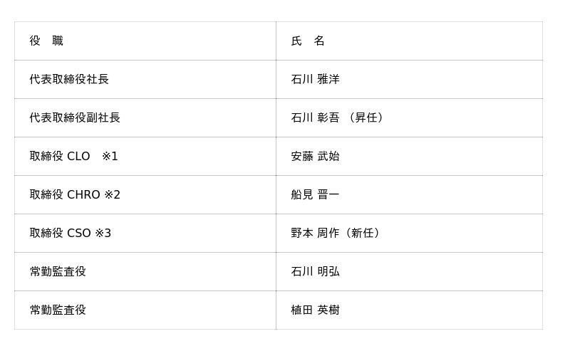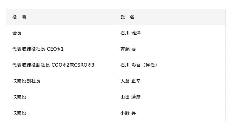 ・現 取締役副社長 石川 彰吾は、新たに代表権が付与され、COOおよびCSROに就任いたします。